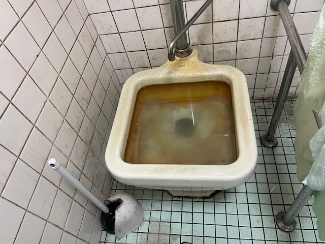 松江市のお客様からトイレにある汚物流しの詰まり修理のご依頼を頂きました。 お伺いしたところ、トイレに設置されている汚物流しが水でいっぱいの状態でした。 お客様が自分で詰まりを直そうとラバーカップでずいぶん苦労されたようで